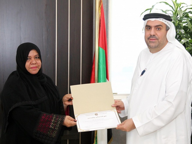 العلماء يكرم موظفة لتوفيرها تكاليف العلاج لمريض في الفجيرة