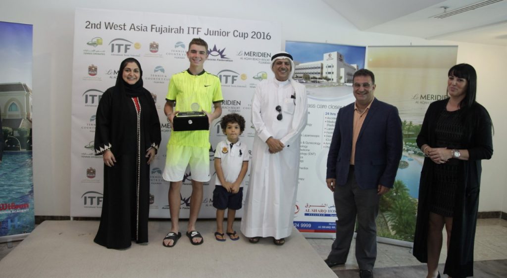 ​توج رئيس مجلس إدارة نادي الفجيرة للتنس الأرضي عبد الغفور بهروزيان اللاعب التشيكي سفرينا داليبور بطلا لدولية الفجيرة للتنس بنسختها الثانية التي اختتمت اليوم ،بتنظيم اتحاد الإمارات للتنس الأرضي ، وإشراف الاتحاد الدولي، بعد أن فاز في المباراة النهائية على المصتف الثاني للبطولة التركي سينيكيز باران بمجموعتين مقابل مجموعة واحدة وبواقع (6-1) و(4-6) و(6-2).