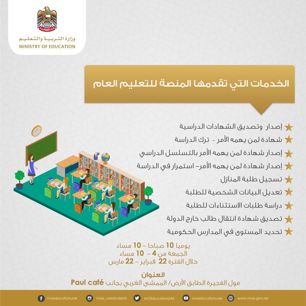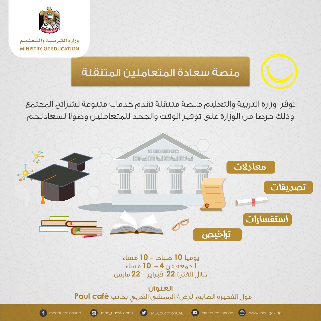وتفصيلا دشنت الوزارة المنصة المتنقلة في إمارة الفجيرة ، بحيث تكون متواجدة في”الفجيرة مول” هناك لمدة شهر كامل و ستقدم للجمهور كافة الخدمات المتعلقة بتصديق الشهادات واستصدار تراخيص الحضانات وبقية خدمات التعليم العام والعالي كما سيتولى القائمين على المنصة تقديم الإجابات عن كافة التساؤلات والاستفسارات الواردة من الجمهور.