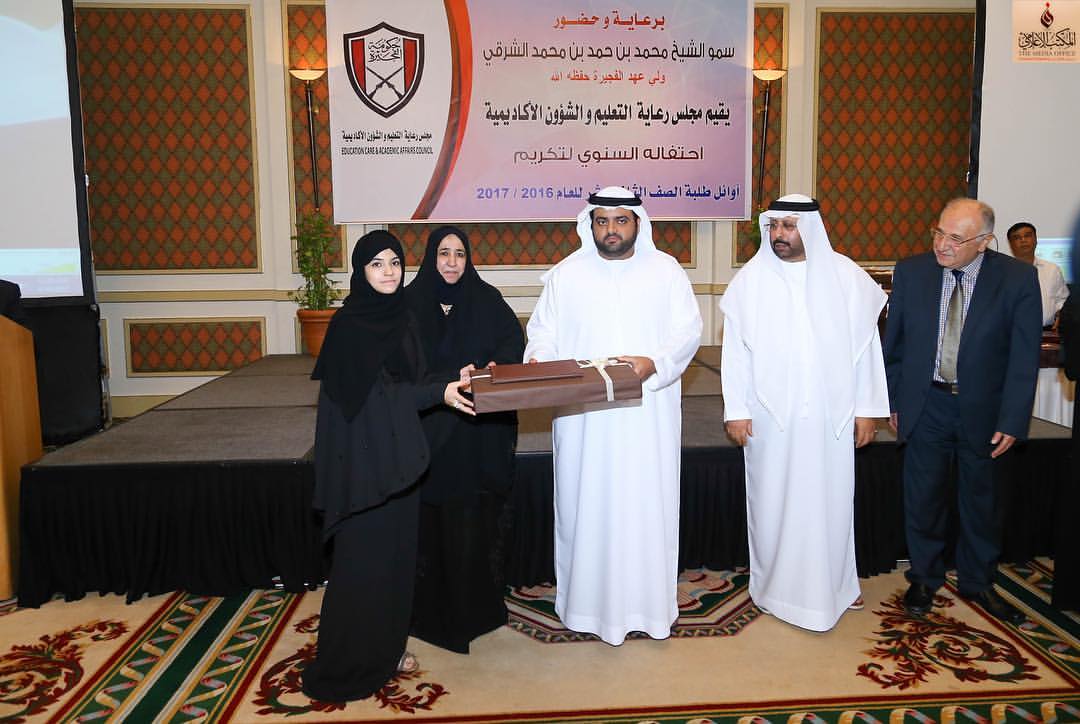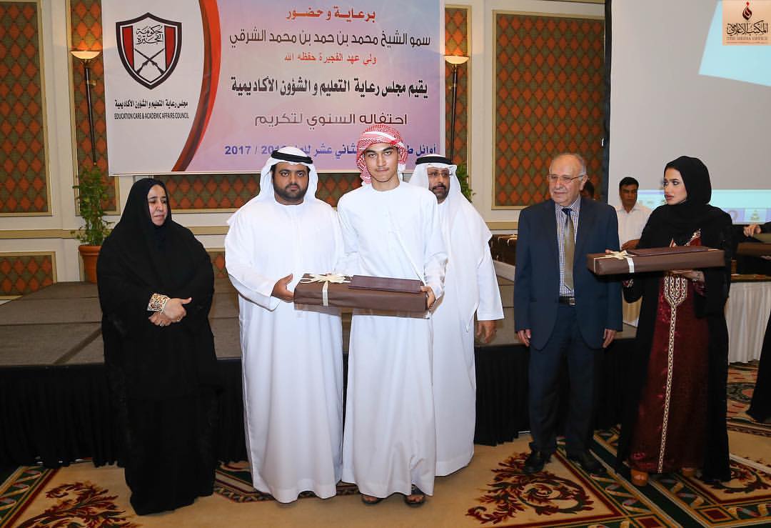 جاء ذلك خلال تكريم سمو ولي العهد طلاب الصف الثاني عشر الأوائل على مستوى الدولة والفجيرة للعام الدراسي الحالي 2016/2017،وذلك في الحفل الذي أقامه مجلس رعاية التعليم والشؤون الأكاديمية بحكومة الفجيرة في فندق سيجي الديار. وحضره إلى جانب سموه، كل من الشيخ عبد الله بن حمد بن سيف الشرقي رئيس الاتحاد الإماراتي لبناء الأجسام والقوة البدنية، وسعادة المستشار راشد عبيد سيف حماد الحفيتي رئيس مجلس رعاية التعليم والشؤون الأكاديمية بالفجيرة.