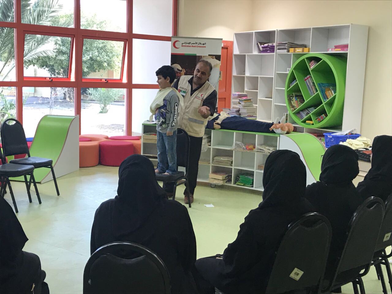 نفذ الهلال الأحمر الاماراتي فرع الفجيرة صباح الامس دورة اسعافات أولية في روضة كلباء قدمها المدرب فايز الشكرجي استهدفت المعلمات وأولياء الامور .