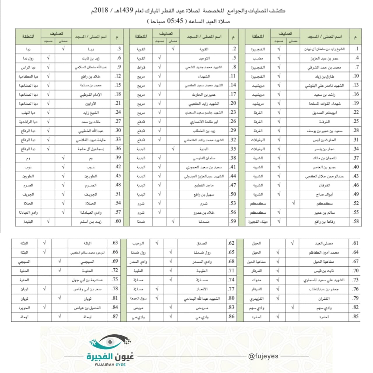 تعرف على المصليات والجوامع المخصصة لصلاة عيد الفطر السعيد في الفجيرة