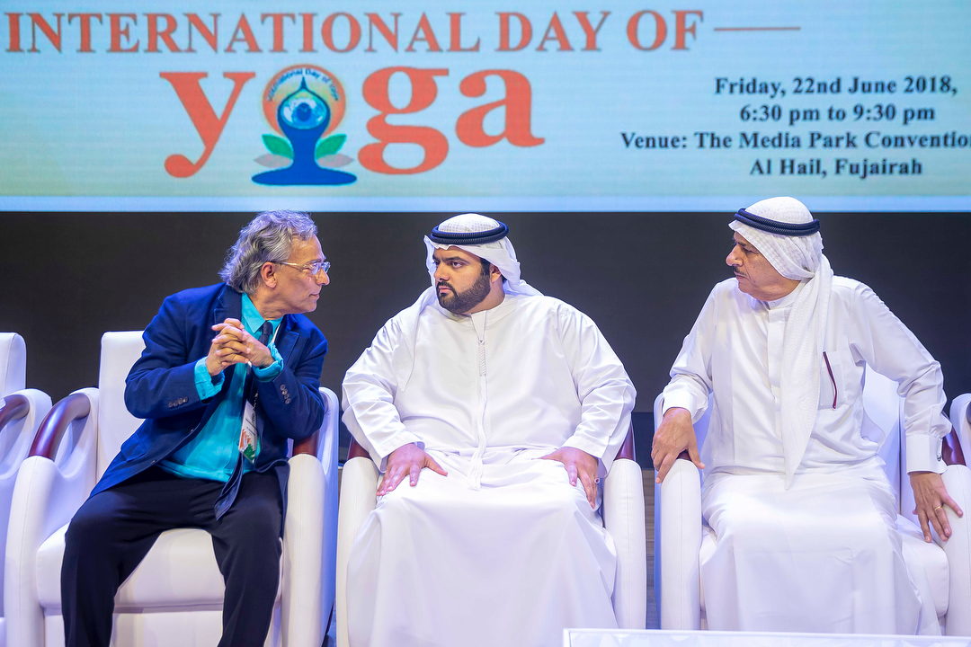 شهد سمو الشيخ محمد بن حمد الشرقي ولي عهد الفجيرة مساء اليوم في مركز المؤتمرات (ميديا بارك) في منطقة الحيل احتفالية اليوم العالمي لليوغا التي نظمها النادي الاجتماعي الهندي بالفجيرة.