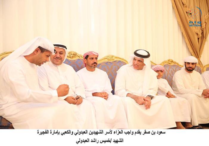 سعود بن صقر يقدم واجب العزاء لأسر الشهيدين العبدولي والكعبي بإمارة الفجيرة