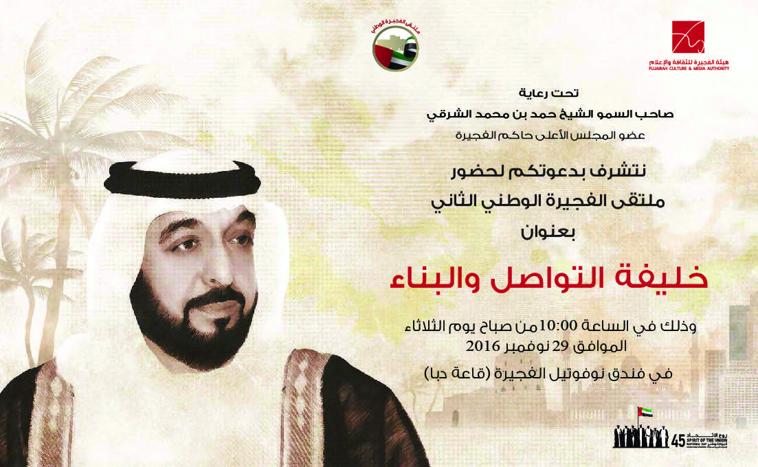 تحت رعاية صاحب السمو الشيخ حمد بن محمد الشرقي عضو المجلس الأعلى حاكم الفجيرة، تقيم هيئة الفجيرة للثقافة والإعلام ملتقى الفجيرة الوطني الثاني تحت عنوان “خليفة ..التواصل والبناء ” وذلك في العاشرة من صباح الثلاثاء التاسع والعشرين من نوفمبر 2015 في فندق نوفوتيل الفجيرة.